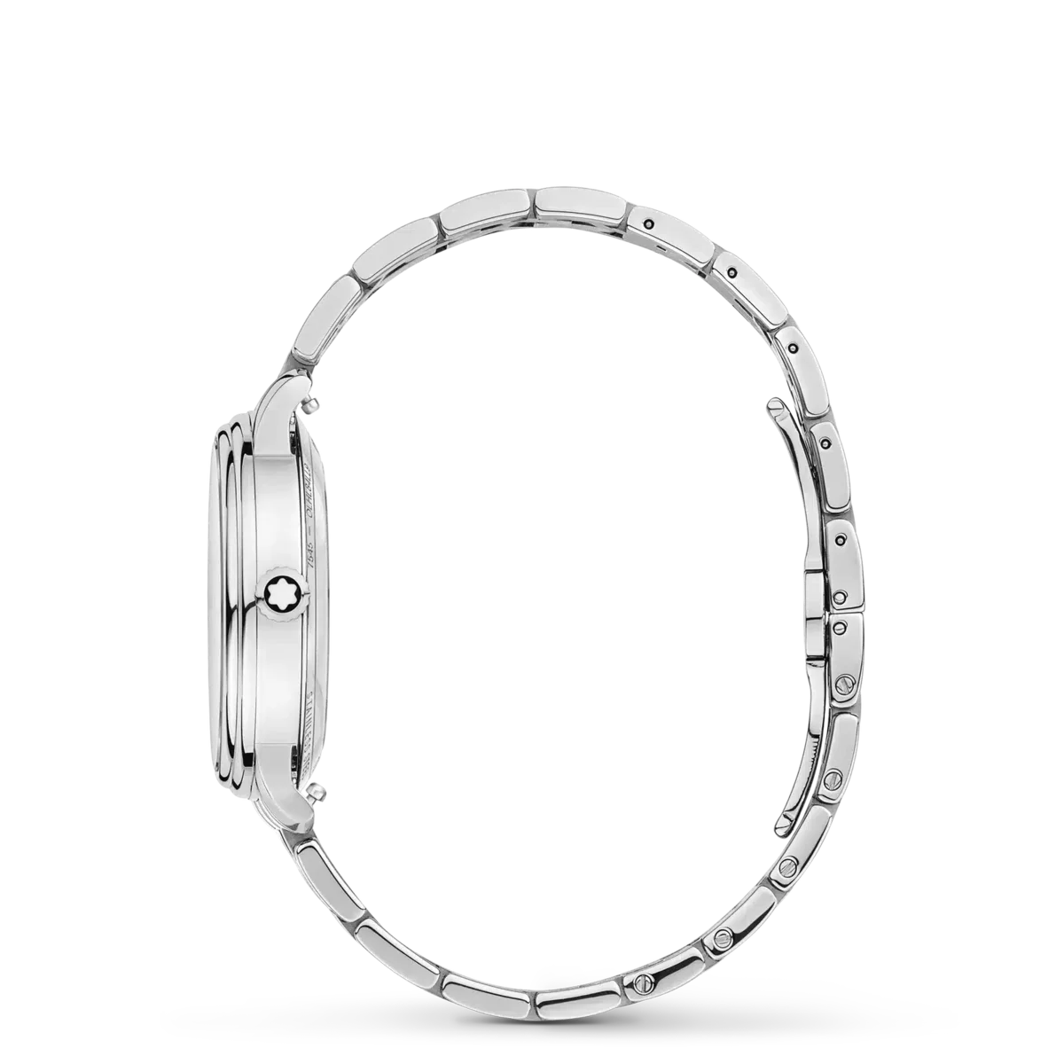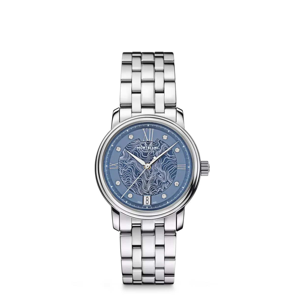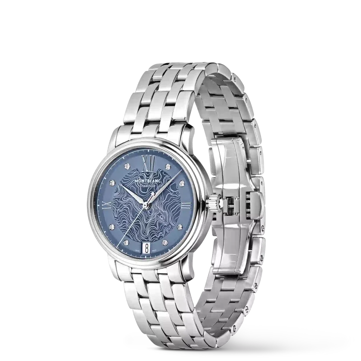El Montblanc Tradition Automatic Date presenta una caja de acero inoxidable de 32 mm con asas rectas y bisel de doble forma. El reloj cuenta con una esfera azul que representa la topografía del Mont Blanc con índices de diamantes, números romanos plateados y un prominente «XII» romano. Las agujas de las horas y los minutos en forma de espada, el segundero y la corona con el emblema de Montblanc, así como el brazalete intercambiable de acero inoxidable, completan su aspecto contemporáneo y elegante.