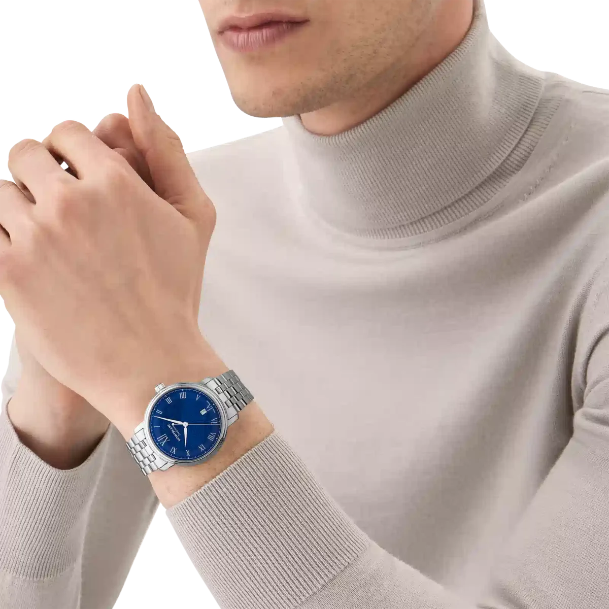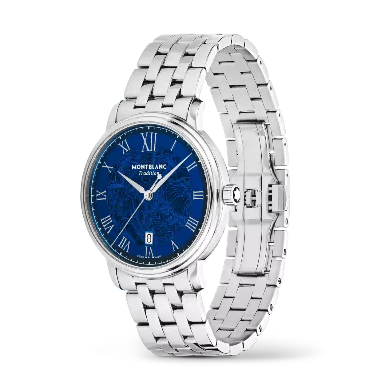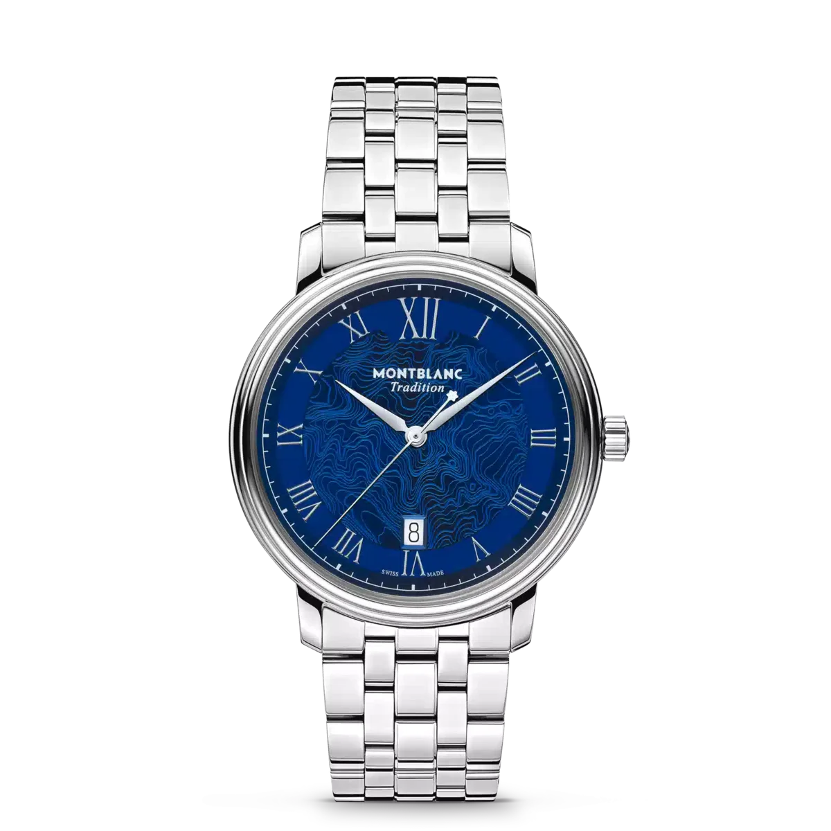 El Montblanc Tradition Automatic Date presenta una caja de acero inoxidable de 40 mm con asas rectas y bisel de doble forma. El reloj cuenta con una esfera azul que representa la topografía del Mont Blanc con números romanos plateados y un prominente «XII» romano. Las agujas de las horas y los minutos en forma de espada, el segundero y la corona con el emblema de Montblanc, así como el brazalete intercambiable de acero inoxidable, completan su aspecto contemporáneo y elegante.