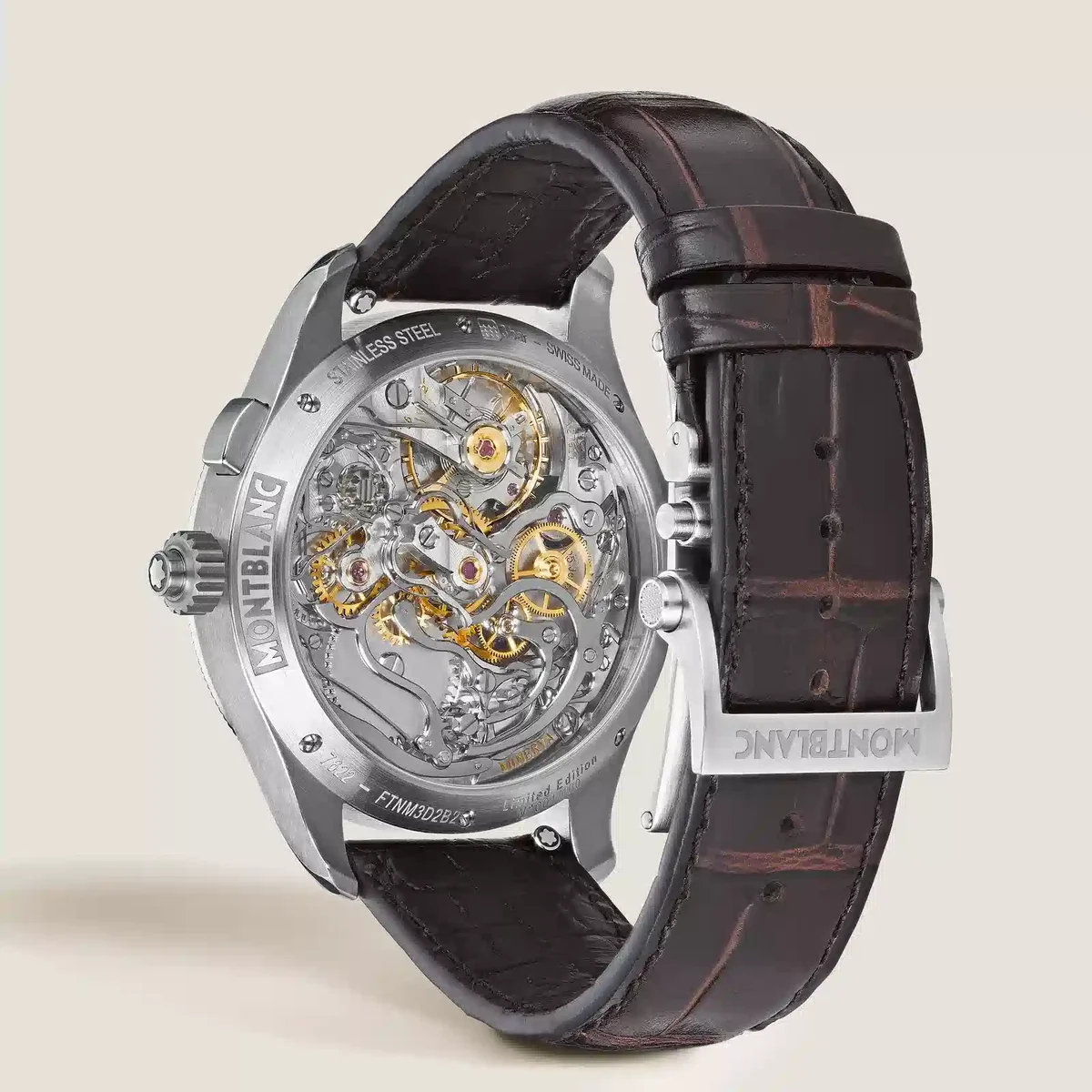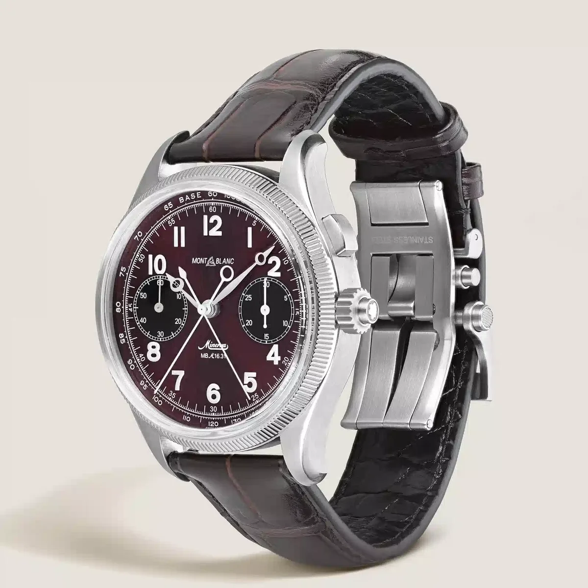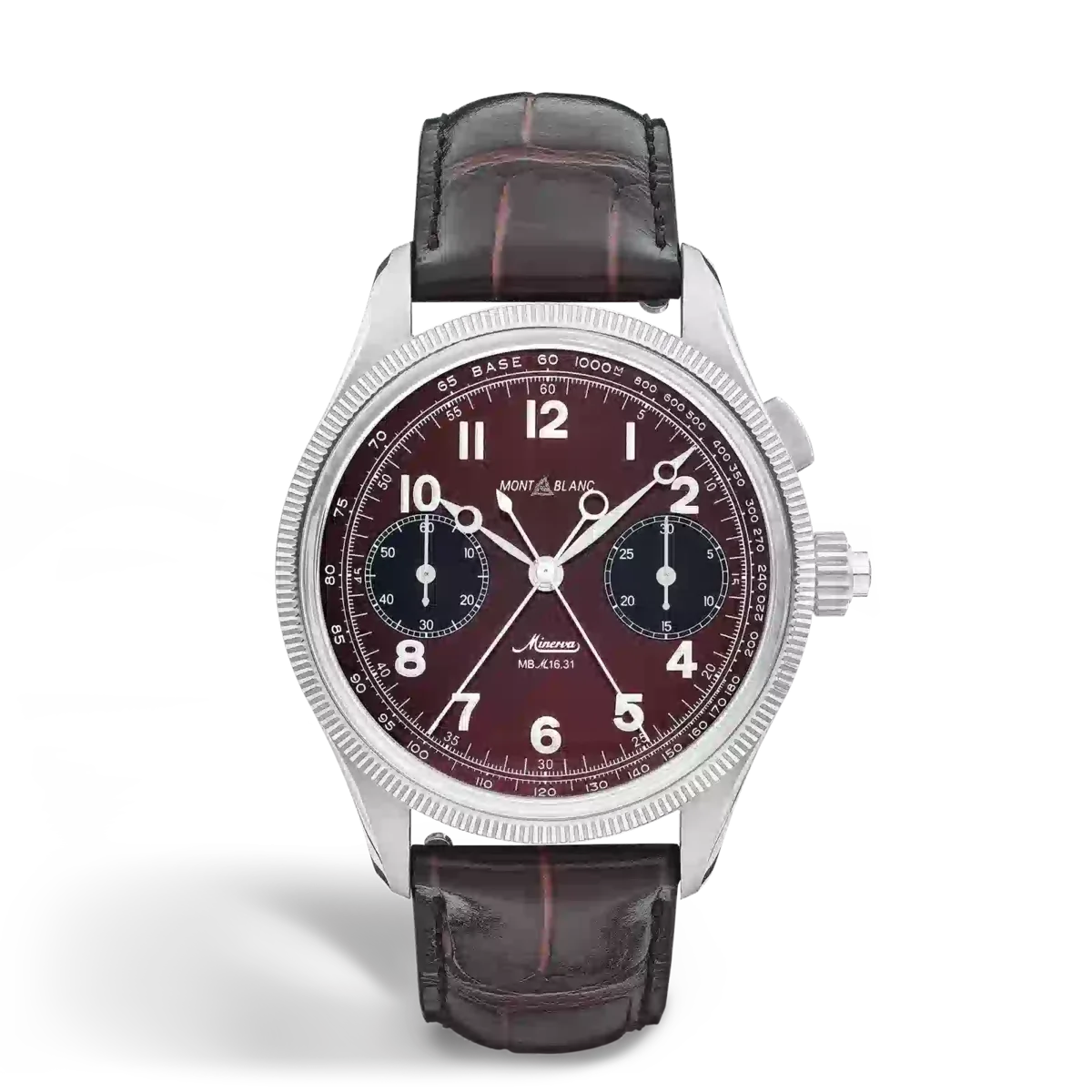 El Montblanc 1858 Cronógrafo Split Second Edición Limitada se inspira en los primeros cronógrafos militares monopulsador split second de 42 mm de la década de 1930. Este nuevo modelo se presenta en una caja de acero inoxidable de 44 mm con un bisel estriado fijo de oro blanco 750/1000 (18 quilates). La esfera es de color burdeos oscuro con decoración rayos de sol, contadores de cronógrafo negros y números arábigos blancos luminiscentes que le confieren un aspecto elegante. Esta esfera, que ofrece legibilidad y un estilo vintage, se ve realzada por las agujas de las horas, los minutos y los segundos de forma vintage, una aguja central de split second y un contador de cronógrafo de 30 minutos. Al igual que en el reloj original, una escala taquimétrica (base 1000) rodea la esfera. El fondo de la caja revela el calibre MB M16.31 de la Manufactura, acabado a mano, de cuerda manual, monopulsador y cronógrafo con segundero fraccionado, que permite al usuario medir tiempos intermedios sin interrumpir la medición continua de un tiempo transcurrido más largo. El reloj se completa con una correa intercambiable de piel de becerro en tono burdeos oscuro con estampado de cocodrilo y un cierre desplegable triple de acero inoxidable con sistema de ajuste fino.