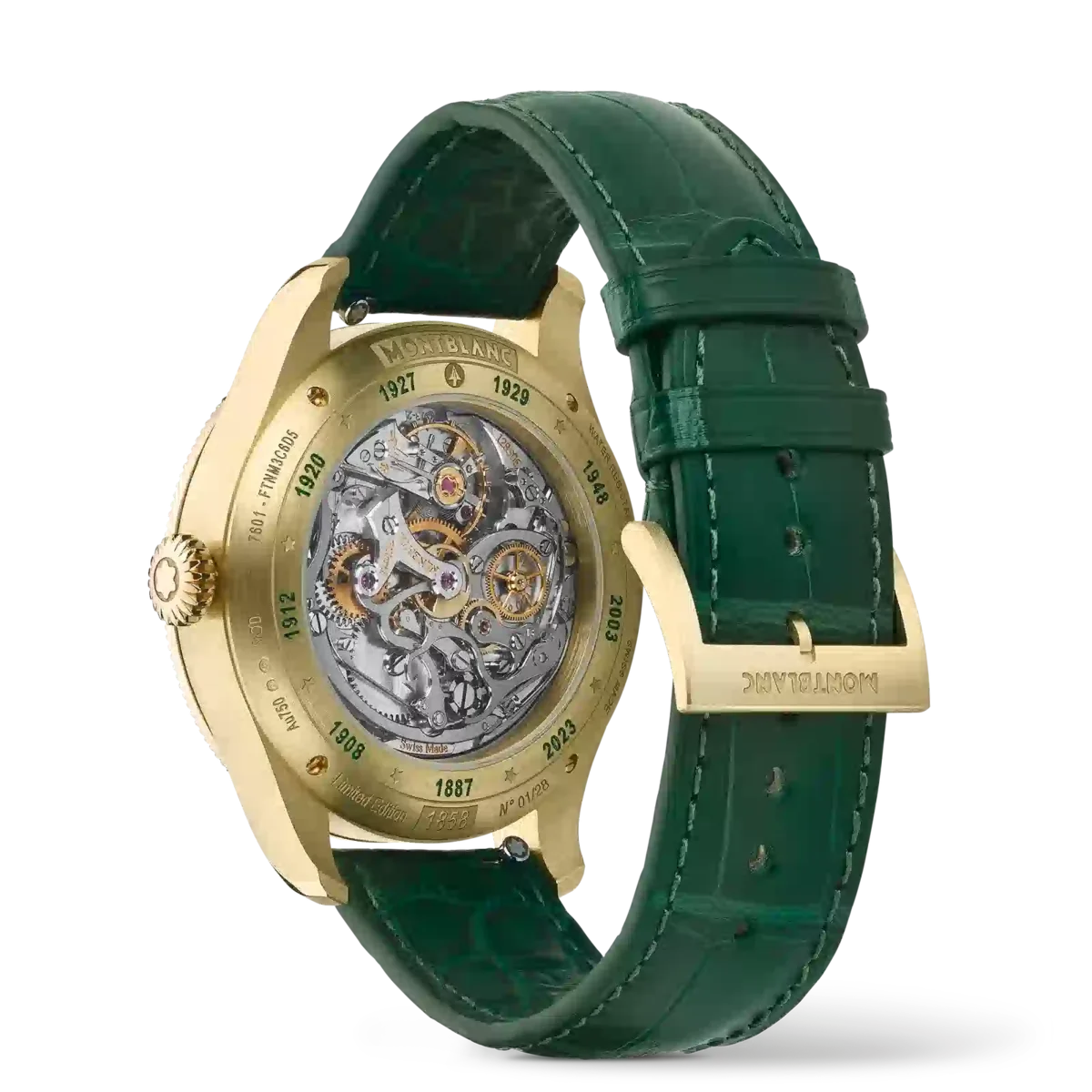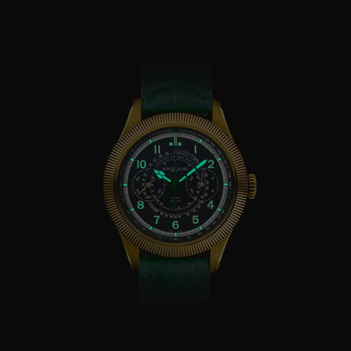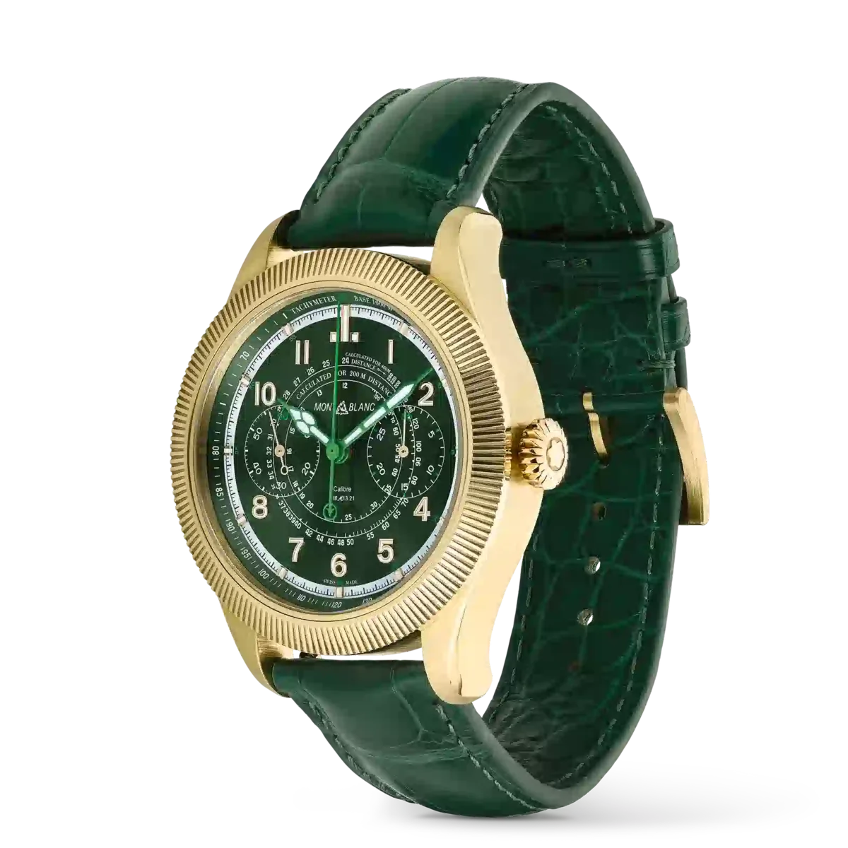 El Montblanc 1858 Unveiled Timekeeper Minerva Edición Limitada presenta una nueva función de cronógrafo. En lugar de utilizar los pulsadores tradicionales, el cronógrafo se activa a través del bisel estriado. Con solo un clic en el bisel estriado de oro lima 750/1000 (18 quilates) se pone en marcha el cronógrafo. Un segundo clic lo detiene y un tercer clic lo reinicia, transformando el cronógrafo tal y como lo conocemos. El reloj viene en una caja de oro lima 750/1000 (18 quilates) de 42,5 mm y está equipado con una esfera verde oscuro y una correa intercambiable de piel de cocodrilo verde. Está impulsado por el calibre MB M13.21 de cuerda manual y acabado a mano, y está limitado a 28 piezas. N.º de identificación: MB130988 Ancho de la asa: 21 mm