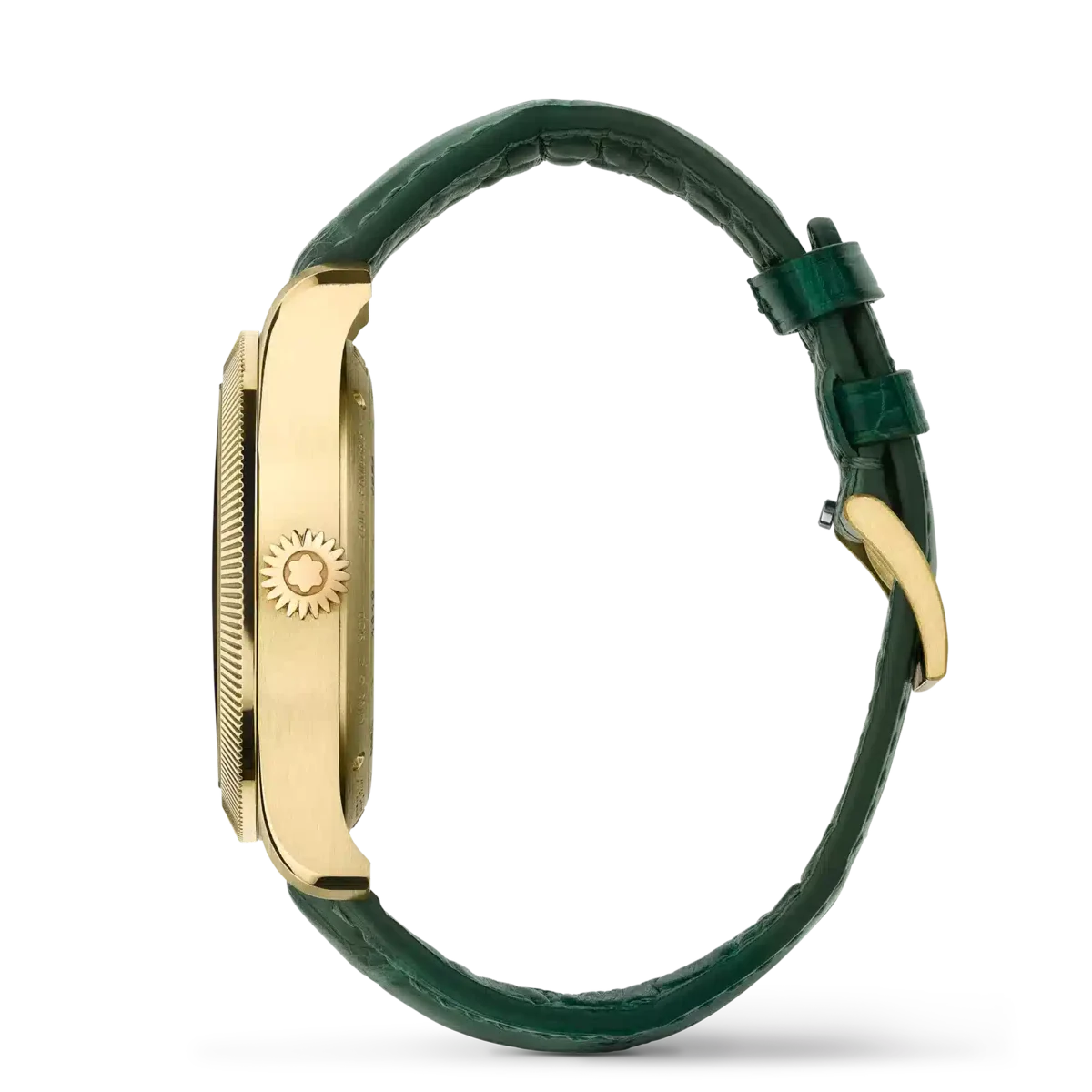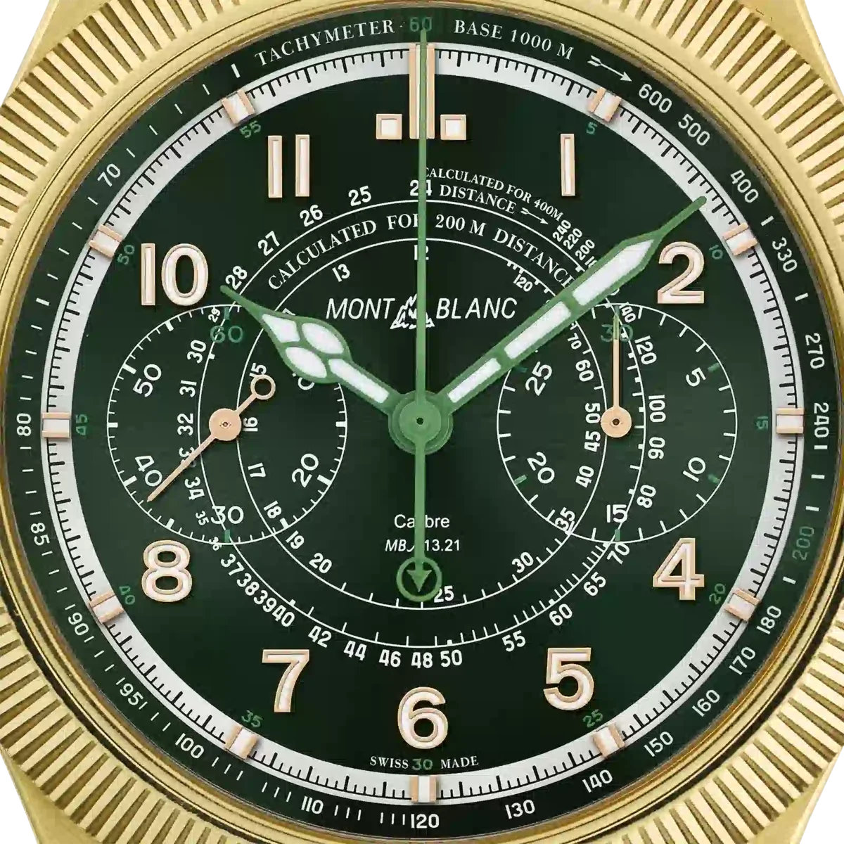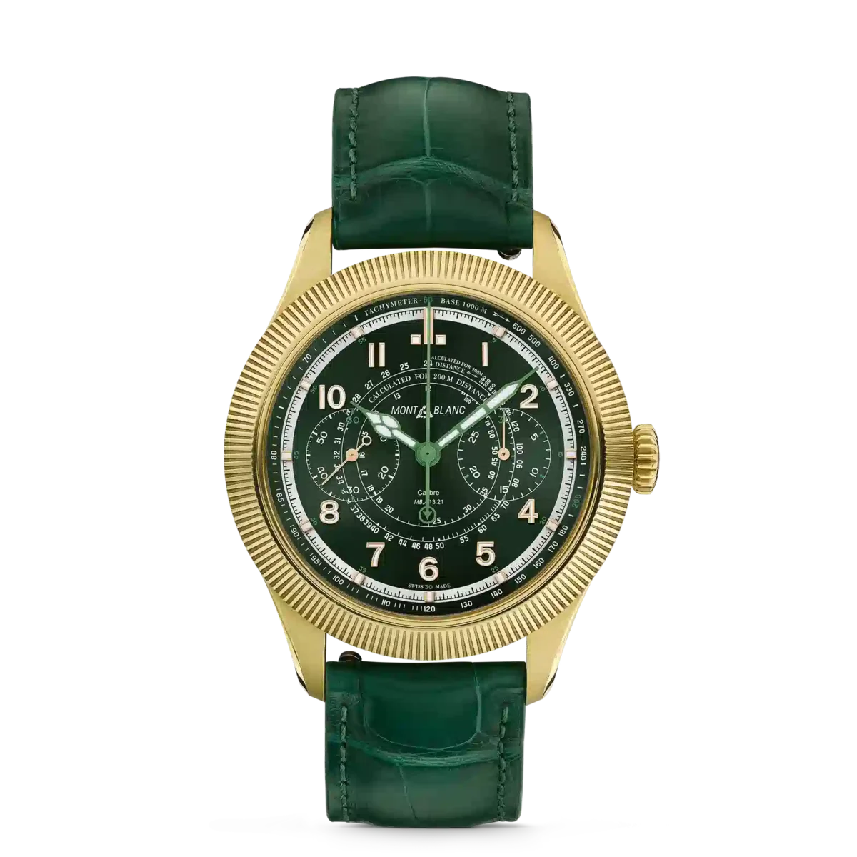 El Montblanc 1858 Unveiled Timekeeper Minerva Edición Limitada presenta una nueva función de cronógrafo. En lugar de utilizar los pulsadores tradicionales, el cronógrafo se activa a través del bisel estriado. Con solo un clic en el bisel estriado de oro lima 750/1000 (18 quilates) se pone en marcha el cronógrafo. Un segundo clic lo detiene y un tercer clic lo reinicia, transformando el cronógrafo tal y como lo conocemos. El reloj viene en una caja de oro lima 750/1000 (18 quilates) de 42,5 mm y está equipado con una esfera verde oscuro y una correa intercambiable de piel de cocodrilo verde. Está impulsado por el calibre MB M13.21 de cuerda manual y acabado a mano, y está limitado a 28 piezas. N.º de identificación: MB130988 Ancho de la asa: 21 mm