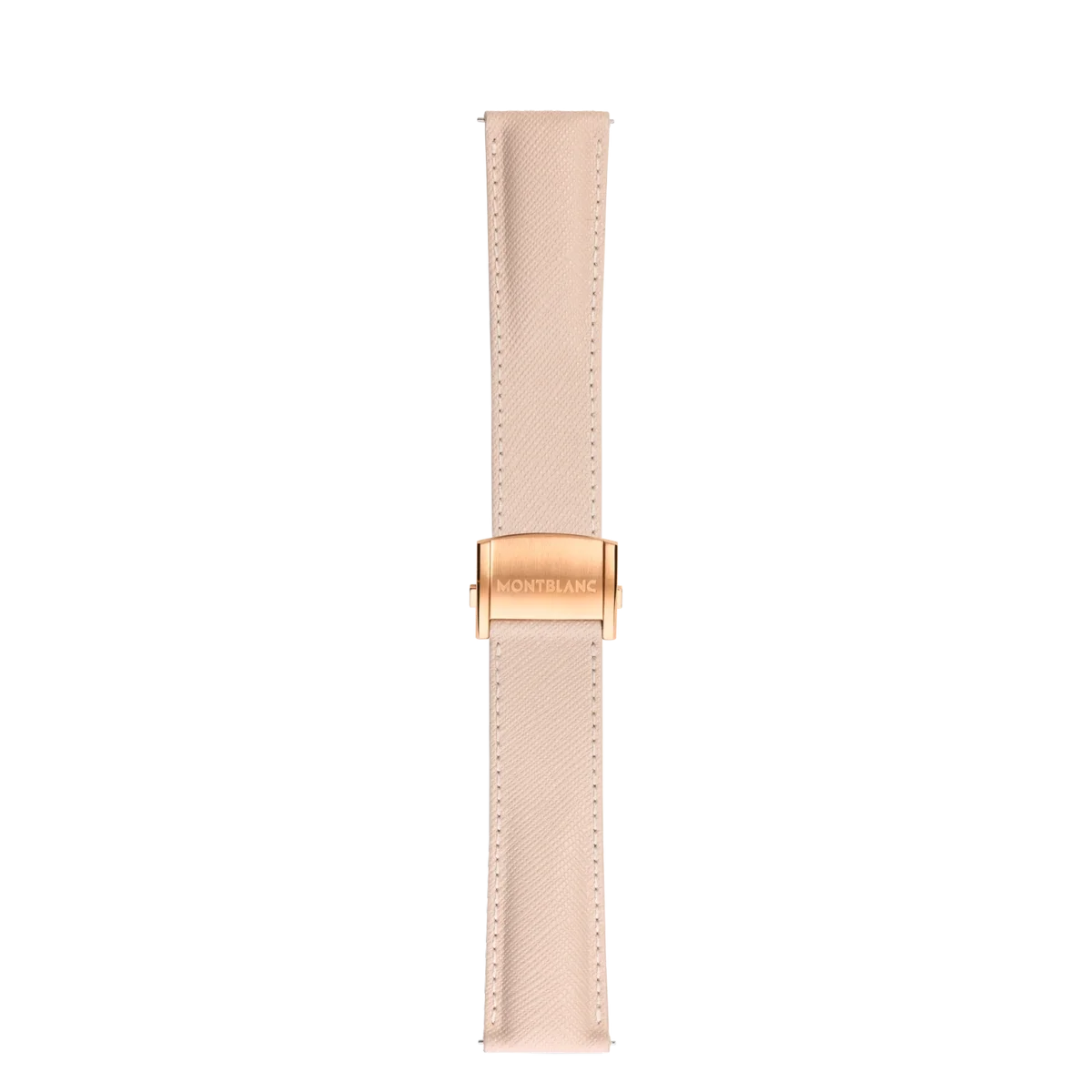 Correa de piel de becerro color crema con estampado saffiano de 22 mm y cierre desplegable ajustable en color dorado fabricado en acero inoxidable. Compatible con todos los relojes inteligentes Montblanc Summit. N.º de identificación: MB127737. Contenido de la caja. Pago. Diseño.